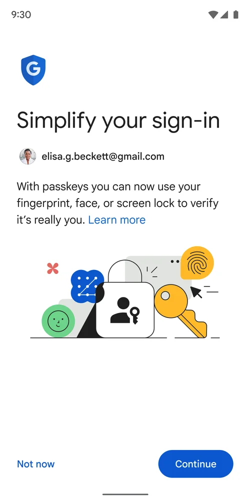 گوگل برای ایجاد حساب‌های برنامه‌هایش توسط کاربران از کلیدعبور/Passkey به‌جای گذرواژه/Password استفاده می‌کند تا کاربران بتوانند به آسانی و راحتی بیش‌تر وارد حساب‌های‌شان شوند.