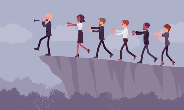 Blind faith followers moving to danger. Group of people come after a person with a flute, subgroup of a religious encharmed with tales, unreasoned belief, not conscious of reality. Vector illustration