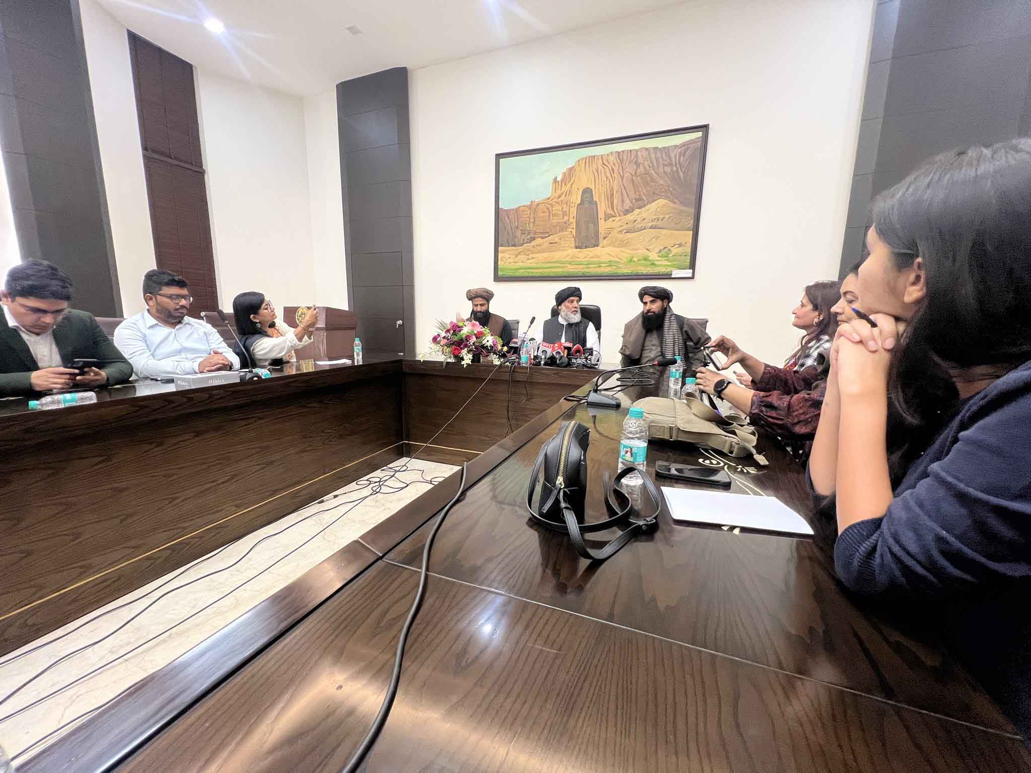 نورالدین عزیزی، وزیر صنعت و تجارت طالبان در سفارت افغانستان در دهلی نو، با حضور خبرنگاران زن نشست خبری برگزار کرد. در پشت سر او تصویر تندیس بودا نیز دیده میشود.